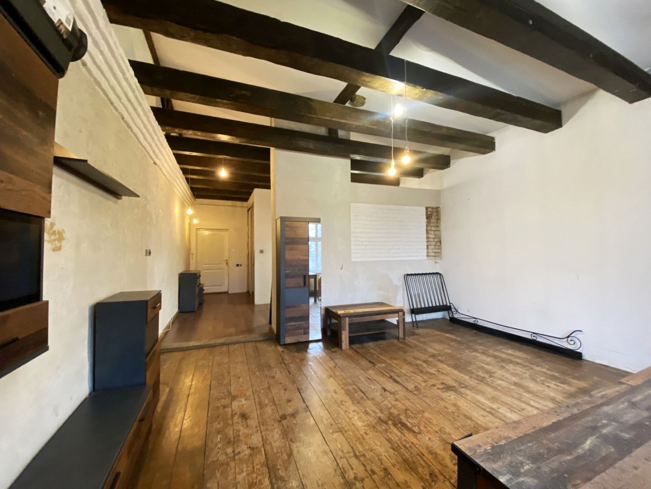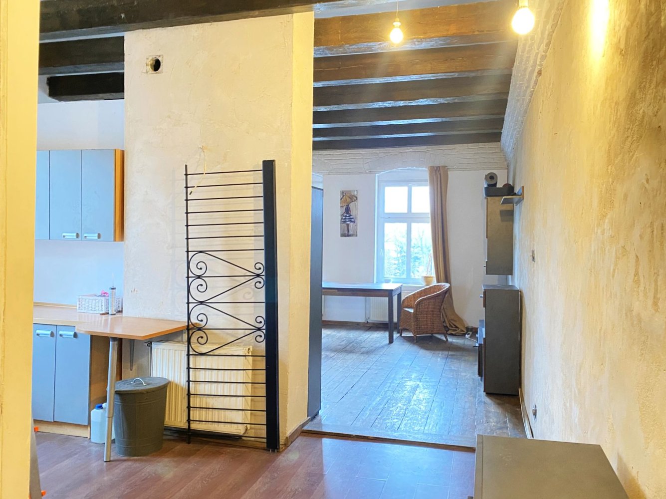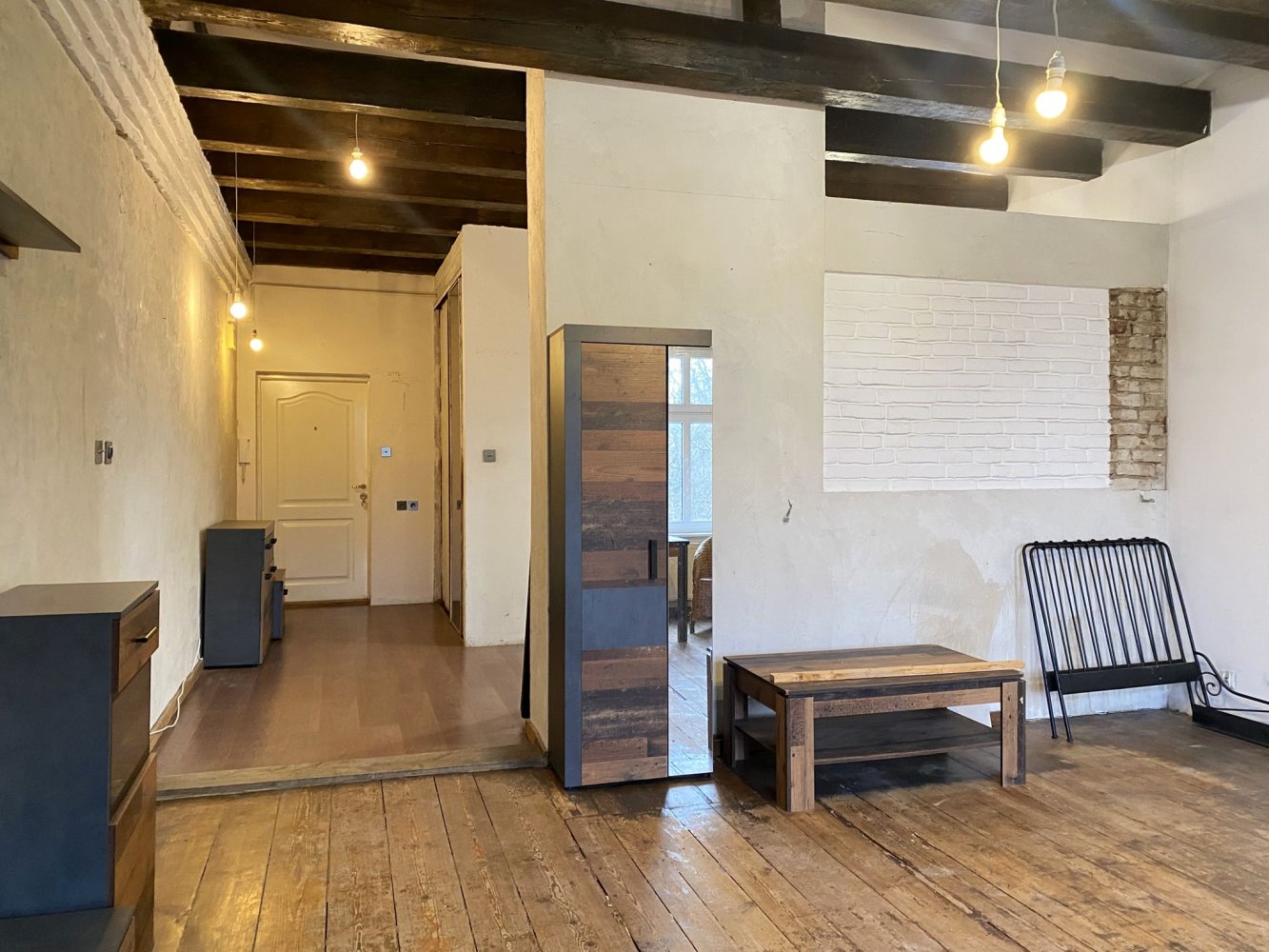 Mieszkanie na poddaszu z odsłoniętymi belkami, świetny klimat mieszkania, w pokoju deski na podłodze.