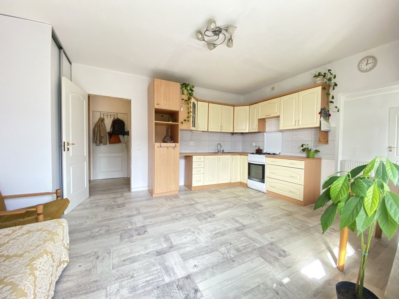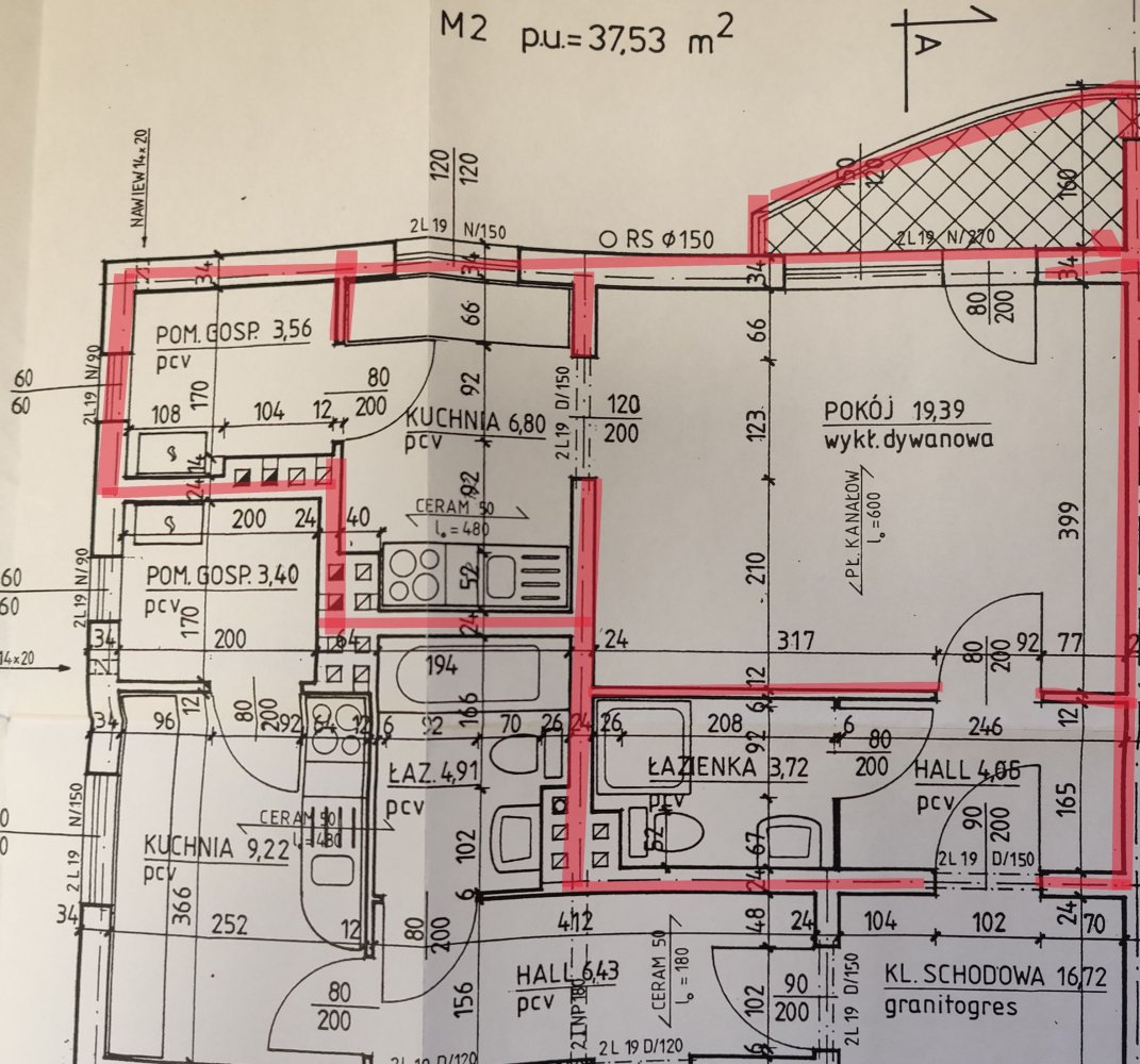 W tej chwili układ mieszkania jest taki, że z przedpokoju wchodzimy do pokoju z aneksem kuchennym (19,39 m2), dalej do małego pokoju (3,72 m2) i dalej do pomieszczenia gospodarczego (3,5 m2).